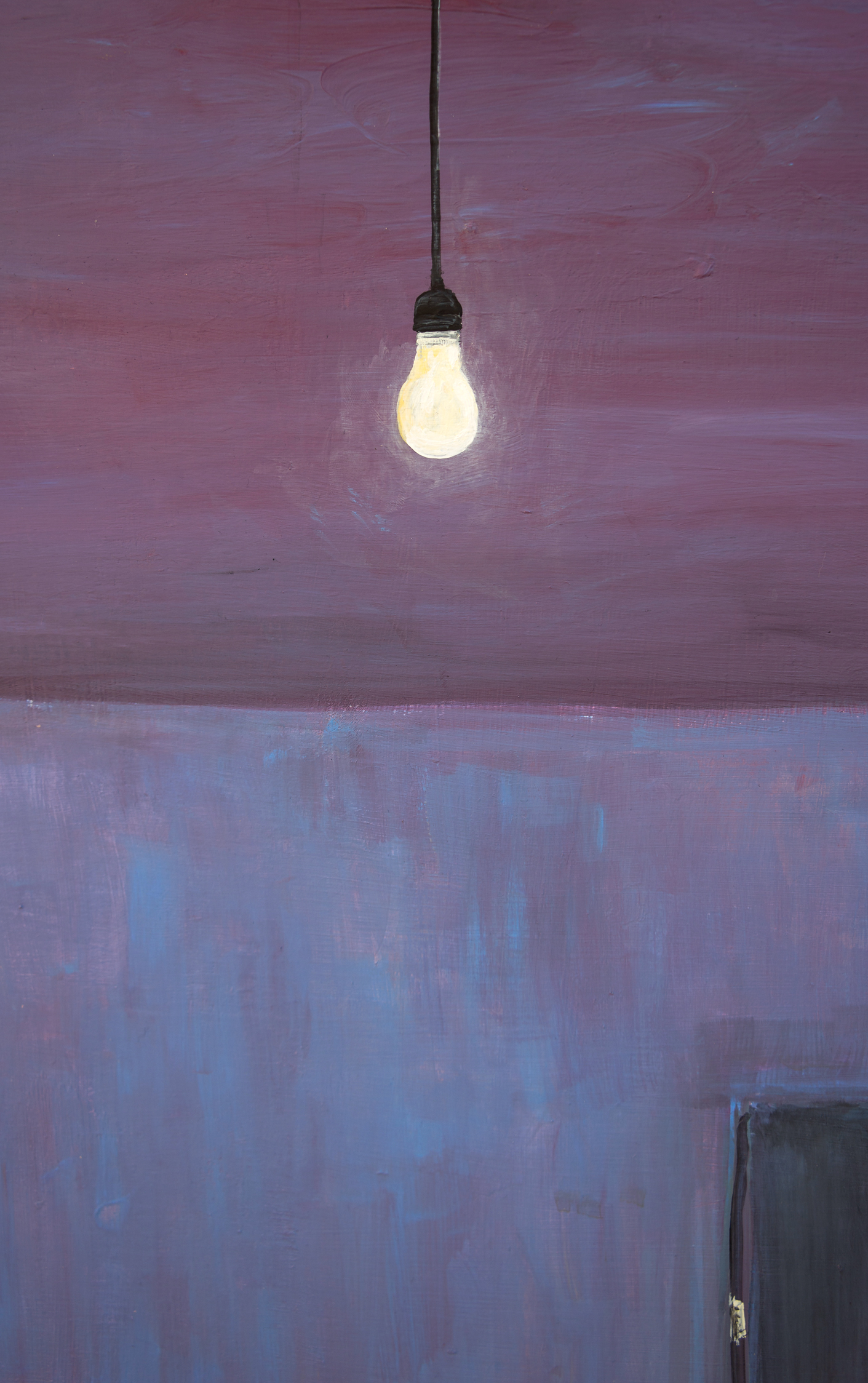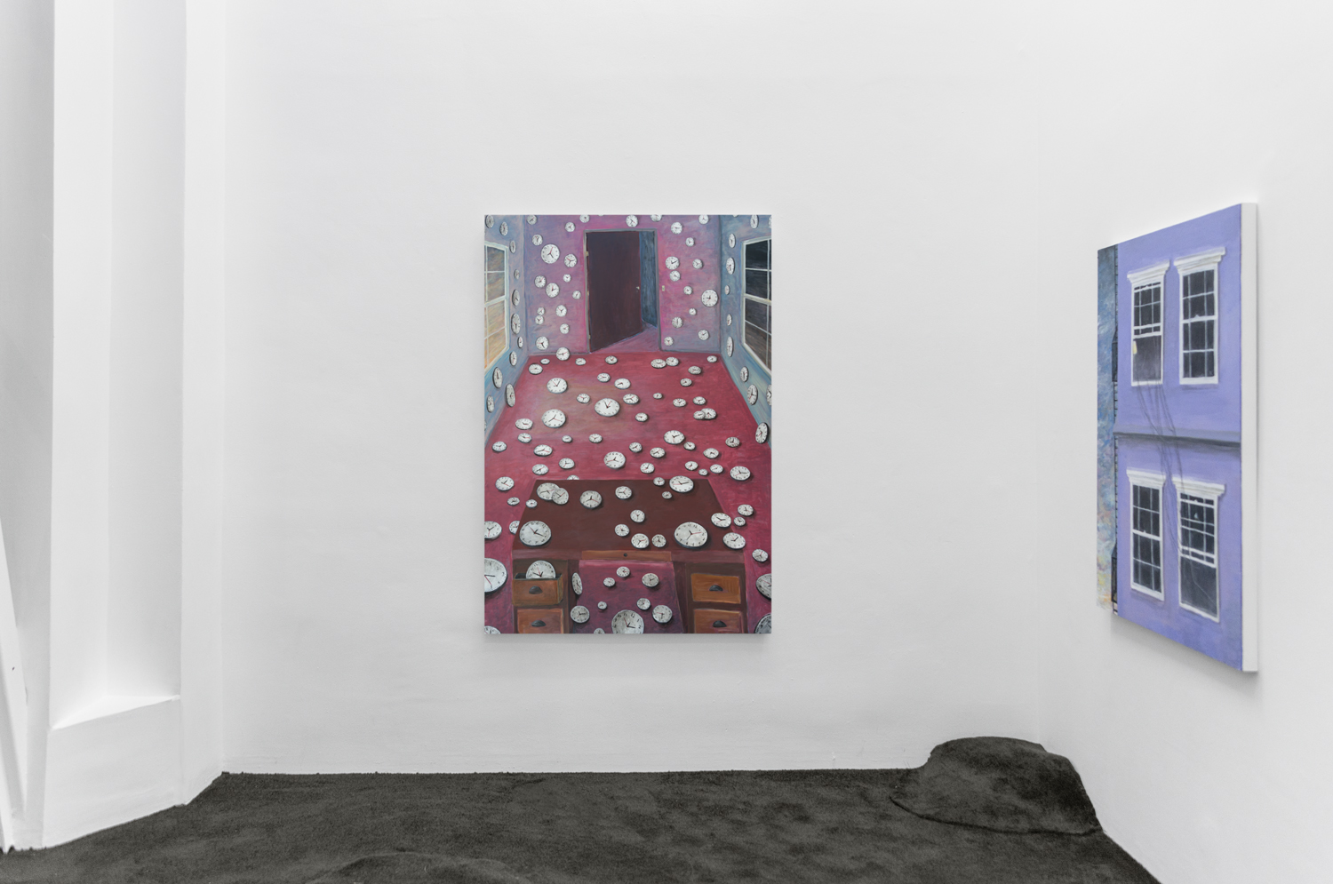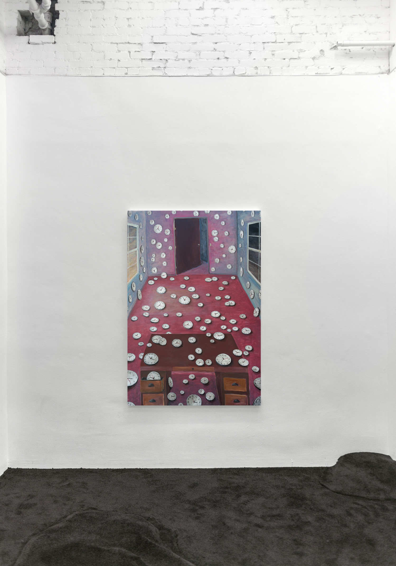 The paintings of Den have become elements of an overarching narrative, where each work accounts for a part of the mise-en-scène. As a setting, a den is a retreat - a private area to pursue personal (sometimes illicit) activities, and each painting directly refers to this idea - relating back to the intrigue of a den's seclusion and the value of privacy. It's as if this mise-en-scène is defined by someone moving throughout the spaces of the paintings, affecting their environments only to retreat back out of frame before altering the space of the gallery itself. What is seen is the effect of a secret individual, a set designer casting objects as metaphors of actions that calls the viewer to participate as a character in the mise-en-scène offering a retreat into a stage of the absurd.