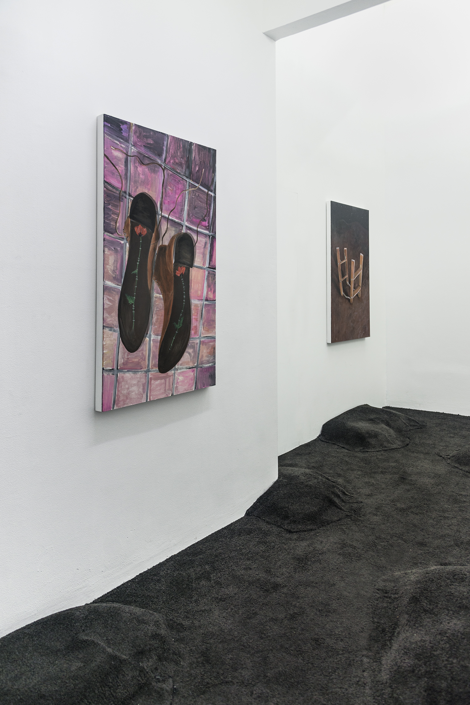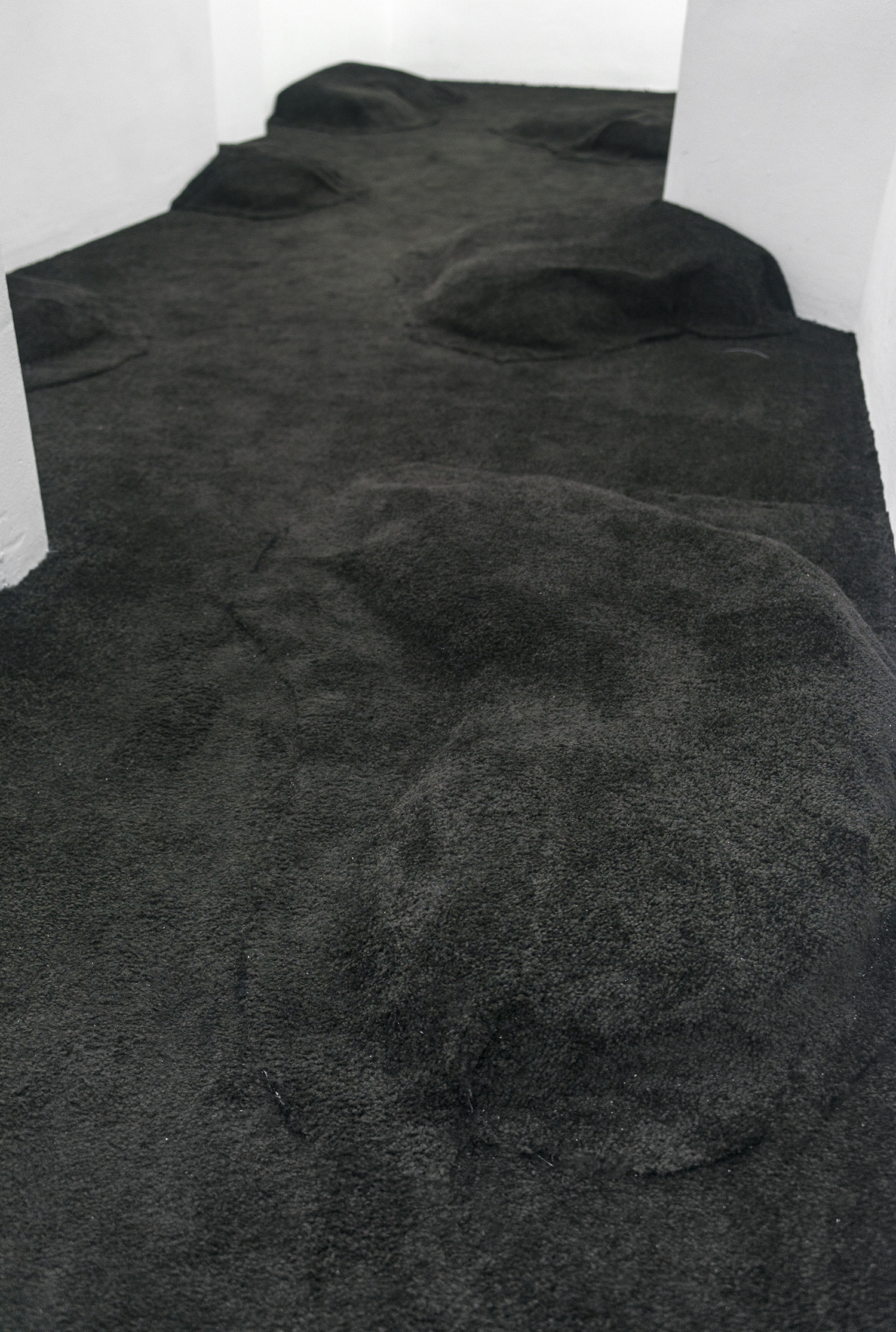 This exhibition reimagines everyday objects as larger than themselves, also extending to the darkly carpeted floor with irregular mounds that offer a directed experience within the scene of the gallery. André Bazin, a French film critic, describes the mise-en-scène as emphasizing choreographed movement within the scene rather than through editing. Here, the commonplace setting is subverted, creating a metaphorical stage defined by its visual components and "acted out" by objects that frequently surround us.