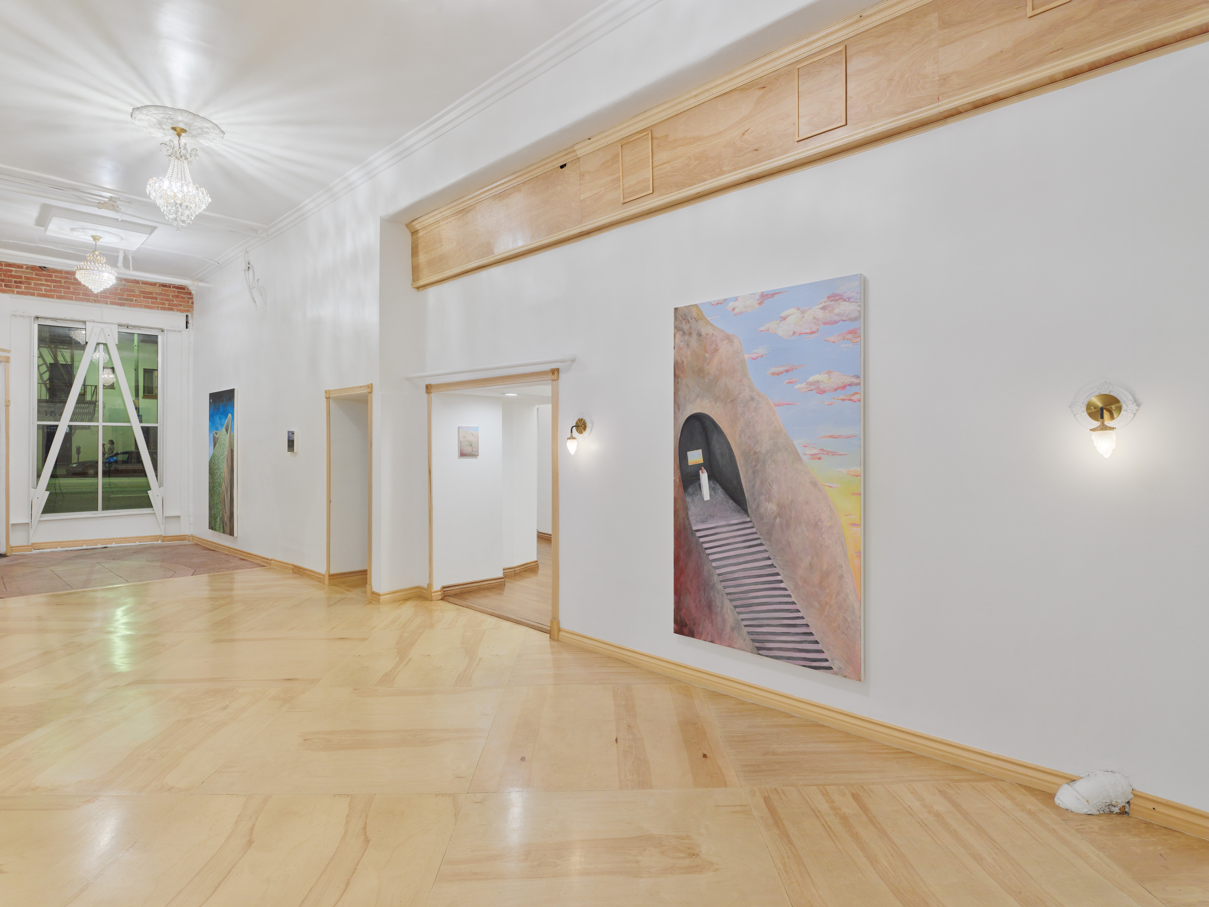 Eventual, forthcoming, expected – also beyond what’s shown or expressed, Ulterior describes paradoxical tensions between architecture, landscape, and objects in an exhibition of new paintings by Derek Paul Jack Boyle. Like a dismembered gallery or studio space, fragments of pensive empty rooms; blank walls, doors, windows, stairs, hallways, collide with and collapse into desert landscapes of canyon clefts, roads, trees, rocks, and prismatic skies. In a show about showing, Boyle equips the stuff of solitude as metaphors for interpersonal dynamics. In lieu of figures, utilities, such as chairs, extension cords, lamps, and ladders, act as characters when set in relation to their broken and amassed surroundings.