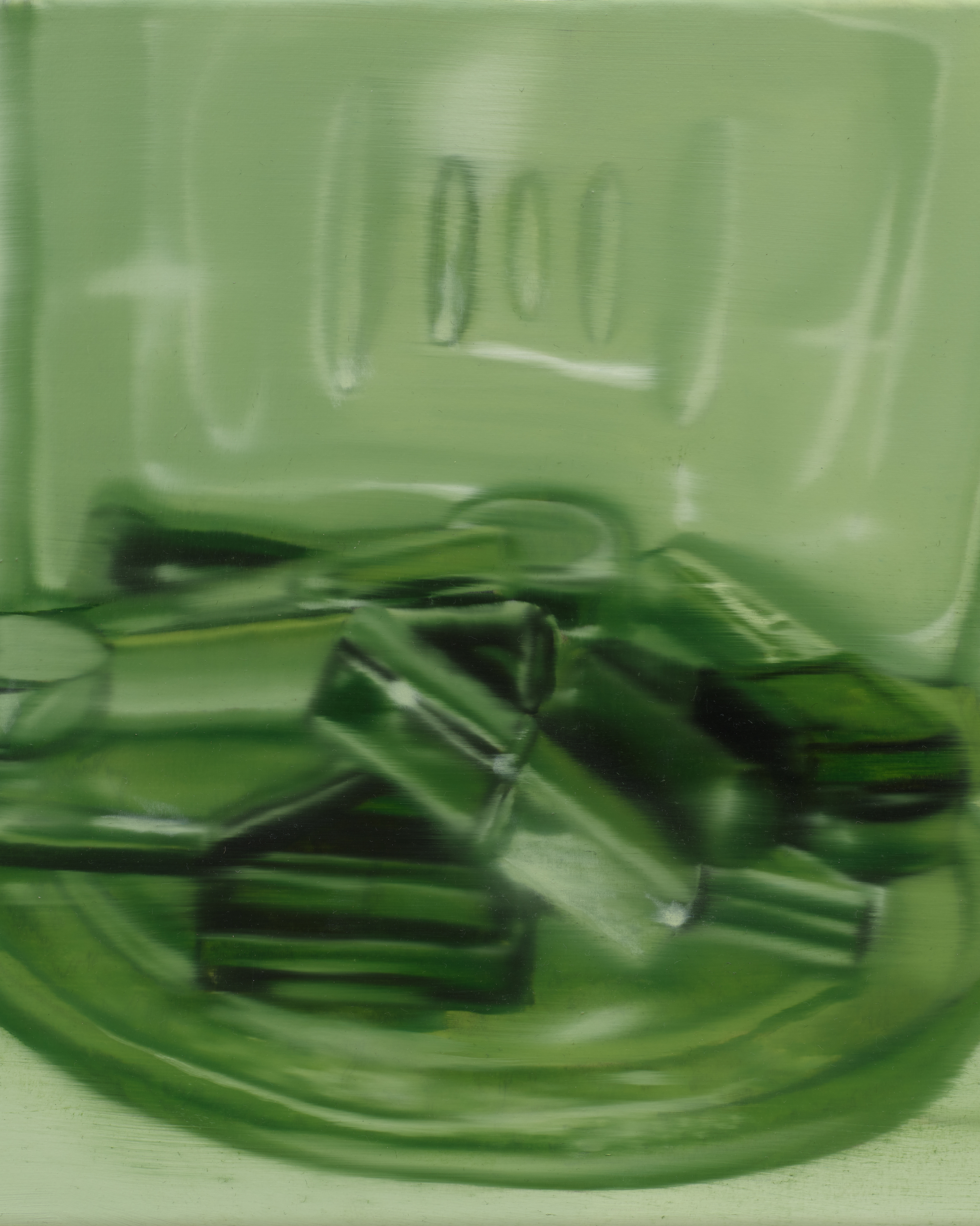 Ellen Hanson’s Battle of the Carmens mirrors this collapse of reality, using layers of distortion to explore how stories are shaped by their repetition. Her paintings don’t just compare events; they enact the way history warps in retelling. Working on jersey fabric, Hanson pulls and stretches it before fully rendering the scenes. Fabrics fill the gaps left by these shifts, creating montaged scenes within scenes. A ‘Richter blur’ ghosts reference images like an unstable VHS caught mid-pause. Stretched and manipulated, the images merge into meta-narratives that reveal relentless cycles of comparison, the tension between internal expectations and external judgment, and the looming threat of unraveling under the weight of an unattainable ideal.