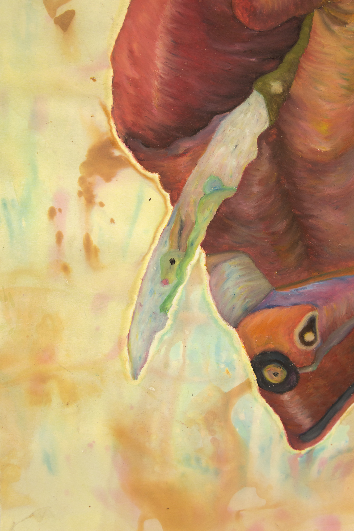 Lily (Moo). A rip in addition to a callback, Oil pastel, oil stick, fabric dye, industrial salt, & fabric spray paint on paper, 22 x 28 in, 2020