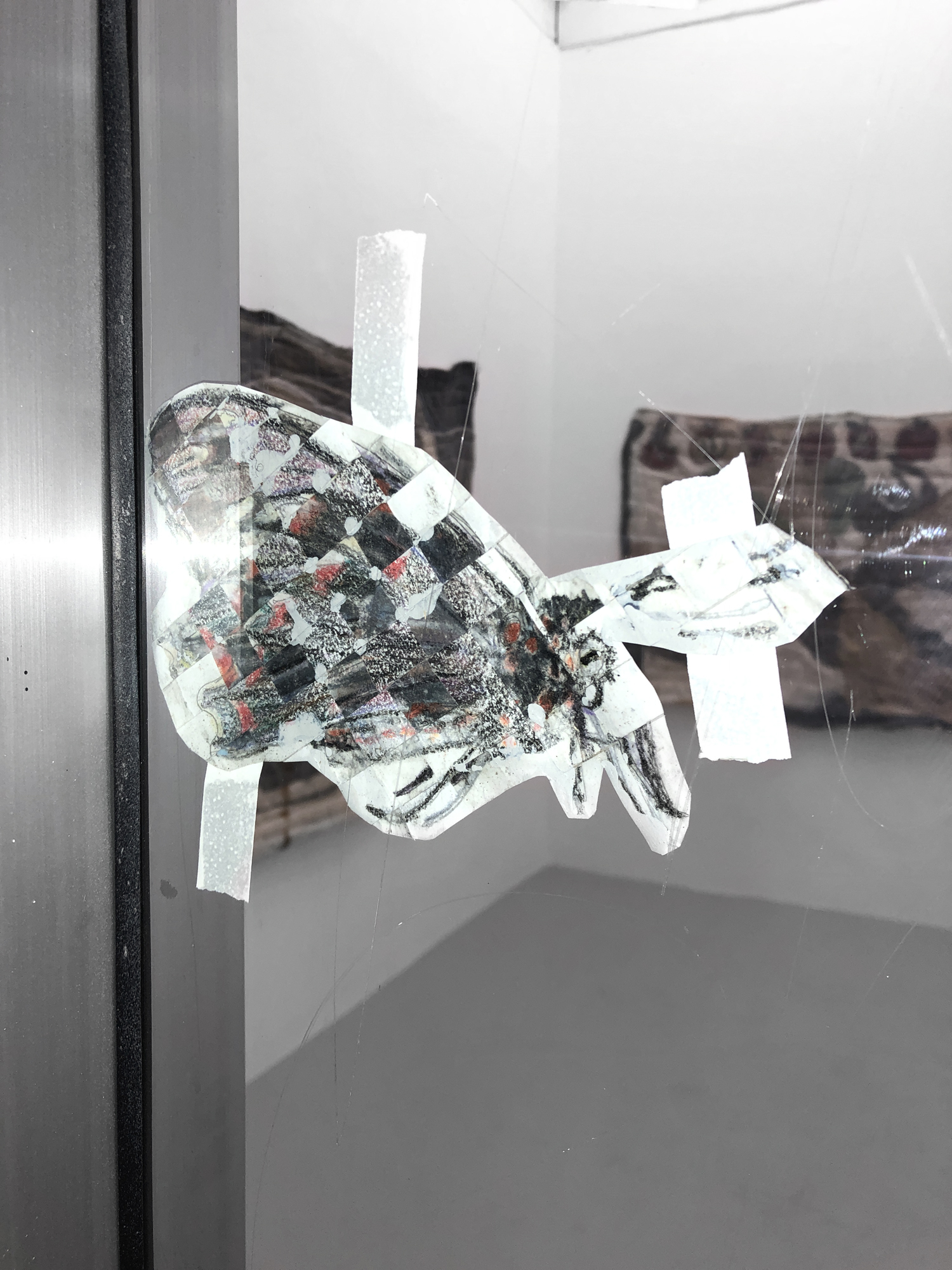 Part metaphor and part material, tension between perceived lightness and weight courses through the works, most notably in a series of tea and plaster sculptures disguised as discarded Styrofoam packaging installed throughout the space as architectural modifications in, around, and delineating sight lines. Two tea and plaster cast sculptures, Dictionary and Thesaurus (at travel sized or pocket-guide proportions) collapse the linguistic and domestic as they explore the construction and upkeep required in both architectural spaces and language. Similarly, lightness and weight are at odds in delicate woven paper butterflies that carry the symbolic weight of representing the nations of the British commonwealth. Echoing in multiple works, the butterfly is known to herald new beginnings, migration, and the pollination from one living thing to the next while cross contaminating new crops, or desired materials, along the way.