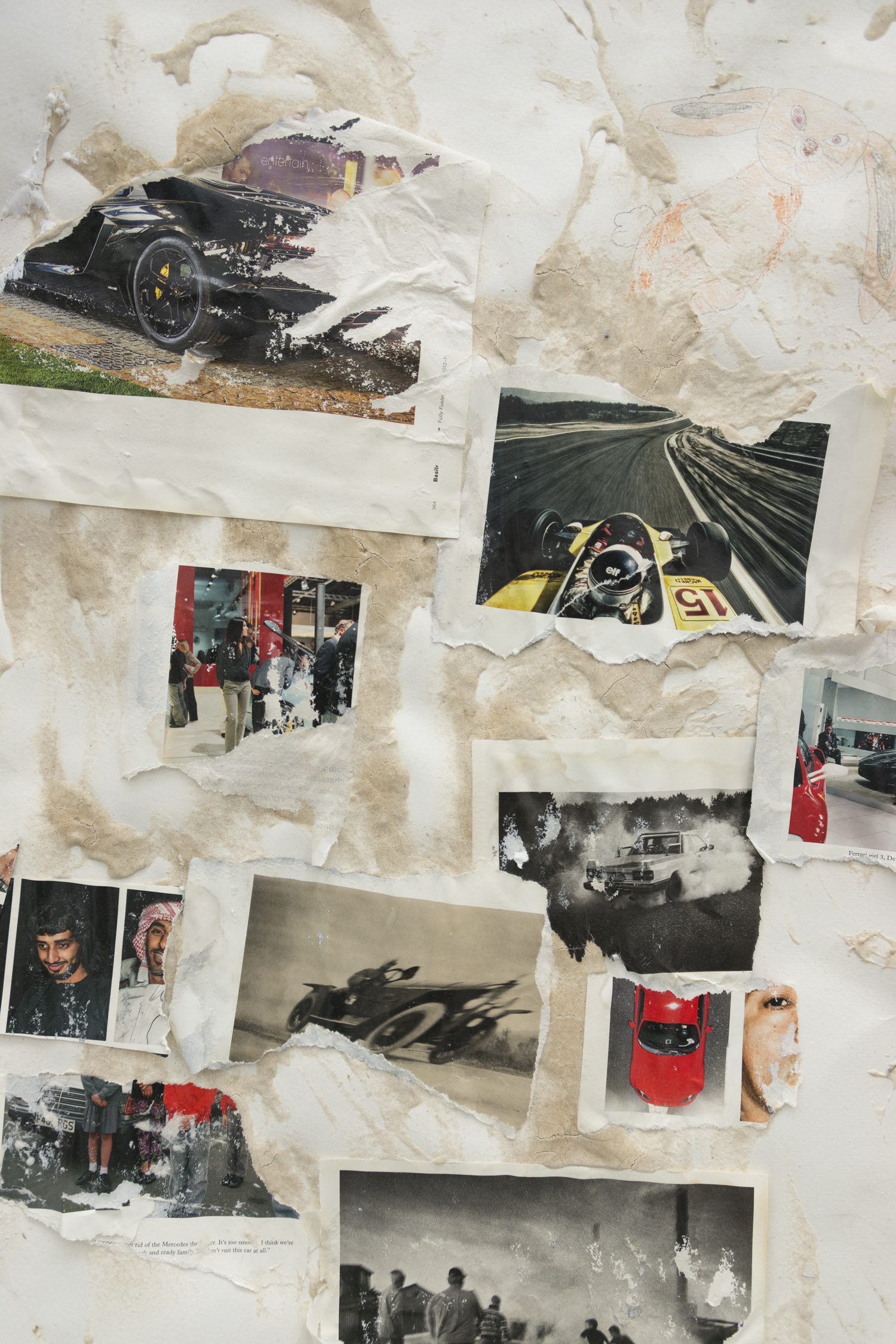 Race, Flooded basement papier-mâché, images from waterlogged photobook, marker, graphite, watercolor on paper 32 x 43 in, 2020-2021