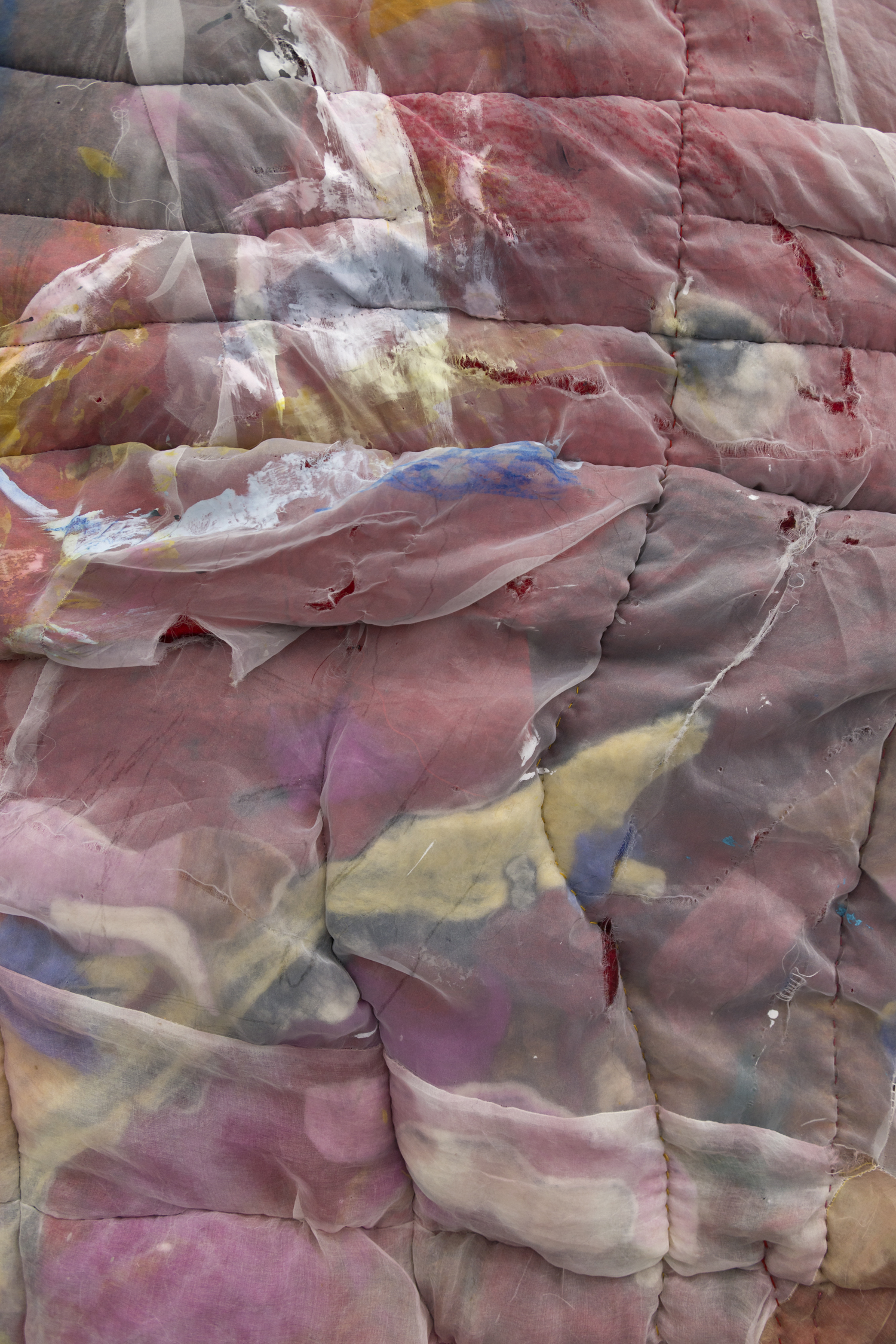 Dying, Wet and needle felted wool, silk, cotton, dye, dying marker; quilted, 65 x 47 in, 2020