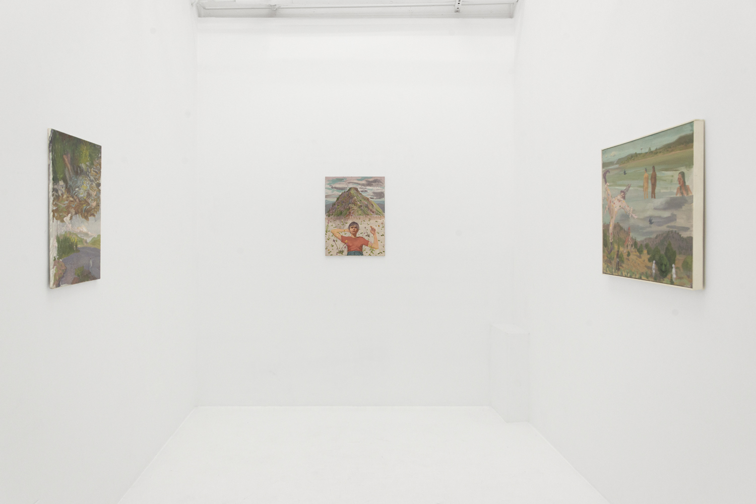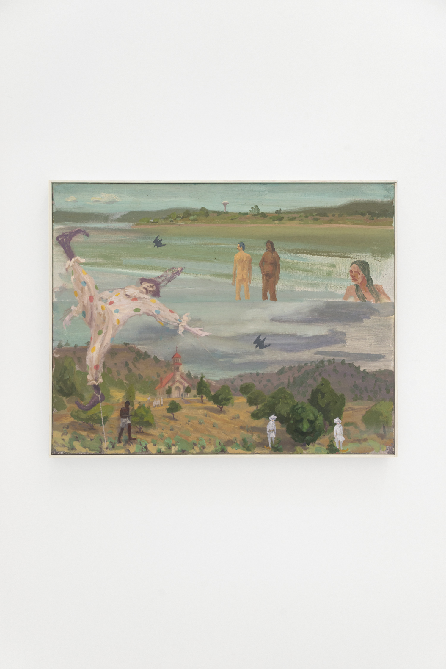 Working between the methods of en plein air, figurative studio painting, and paneled comics, Bruno’s work depicts a near future that is both lush and dystopian, surreal and eminently recognizable. Each painting is begun en plein air, often with two halves of the same canvas bearing distinct but complementary settings. Bruno finds inspiration in the familiar landscapes of the American West, scenes one might find on an aimless drive down old county highways or a hike on public lands.